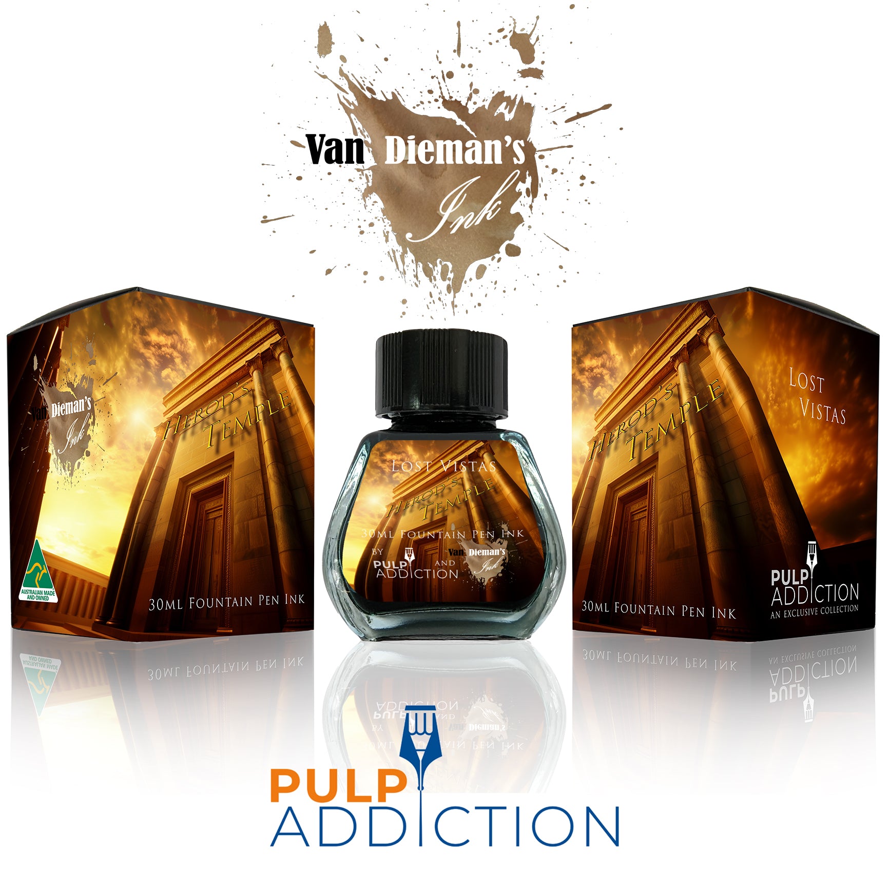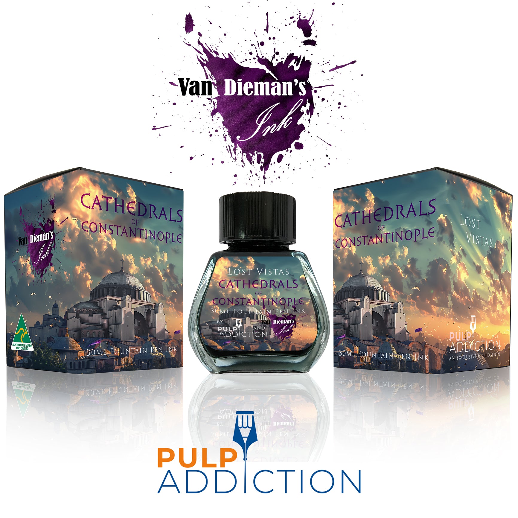 Embark on a journey through history with the exclusive "Lost Vistas" ink collection, meticulously crafted by Van Dieman's Ink Company in Tasmania for Pulp Addiction. This unique collection of seven fountain pen inks pays tribute to the awe-inspiring beauty of landmarks and landscapes that once graced our world but now live on only in memory and lore. From the majestic Walls of Troy to the serene Beaches of Pompeii, each color in the collection is named after these cherished sites, evoking the splendor and stories they once held. The Libraries of Alexandria, Gardens of Nineveh, Cathedrals of Constantinople, and the enigmatic Jungles of Antarctica come alive through vibrant hues, inviting both history aficionados and curious minds to explore the tales and tragedies of our past. This collection is not just an offering of exceptional inks; it's an homage to the places and the rich history they represent, reminding us of the beauty that was lost and inspiring a deeper appreciation for our world's diverse heritage. As you explore these inks, we invite you to reflect on the legacy of these wonders, forever captured in the art of writing.