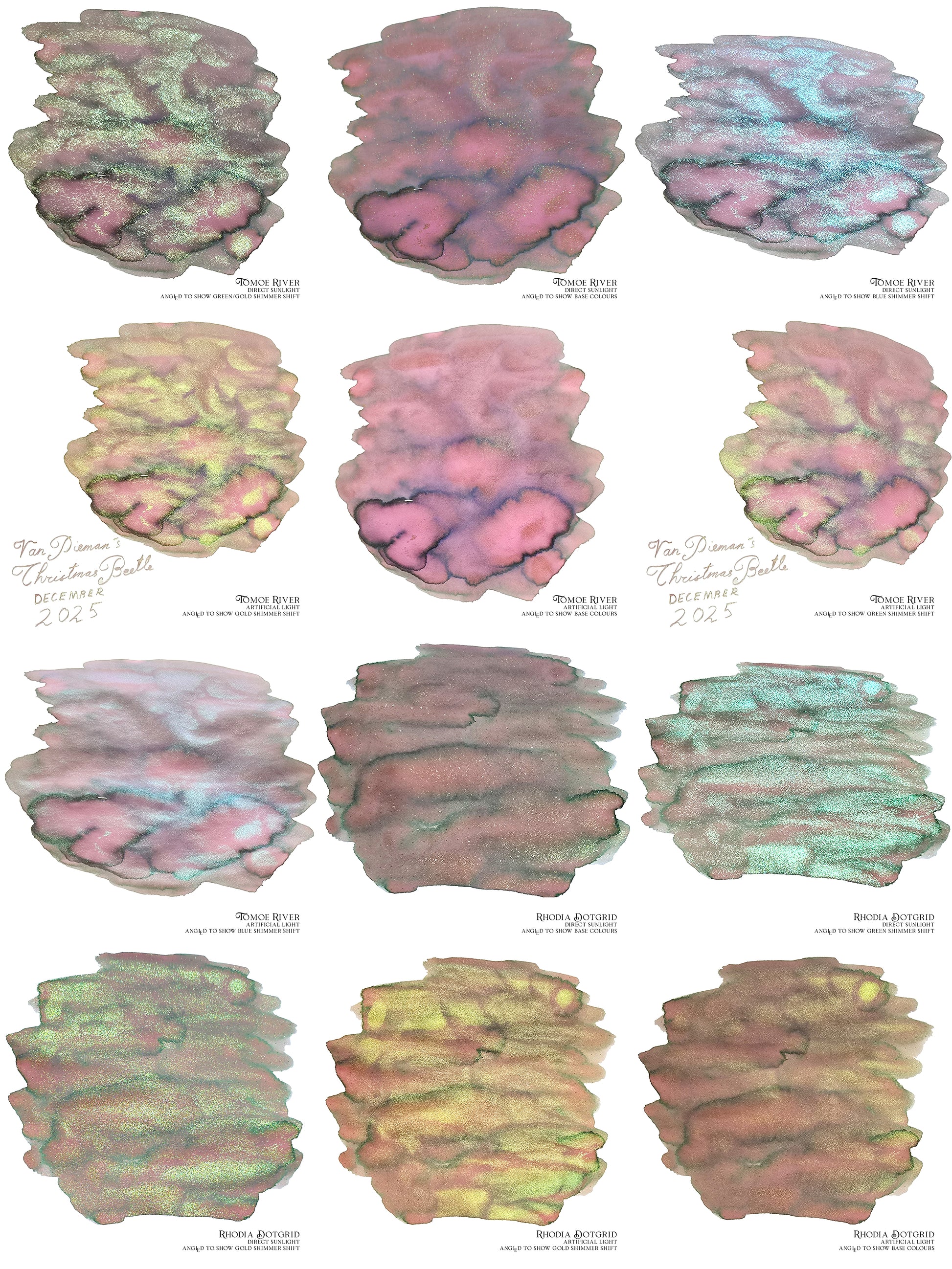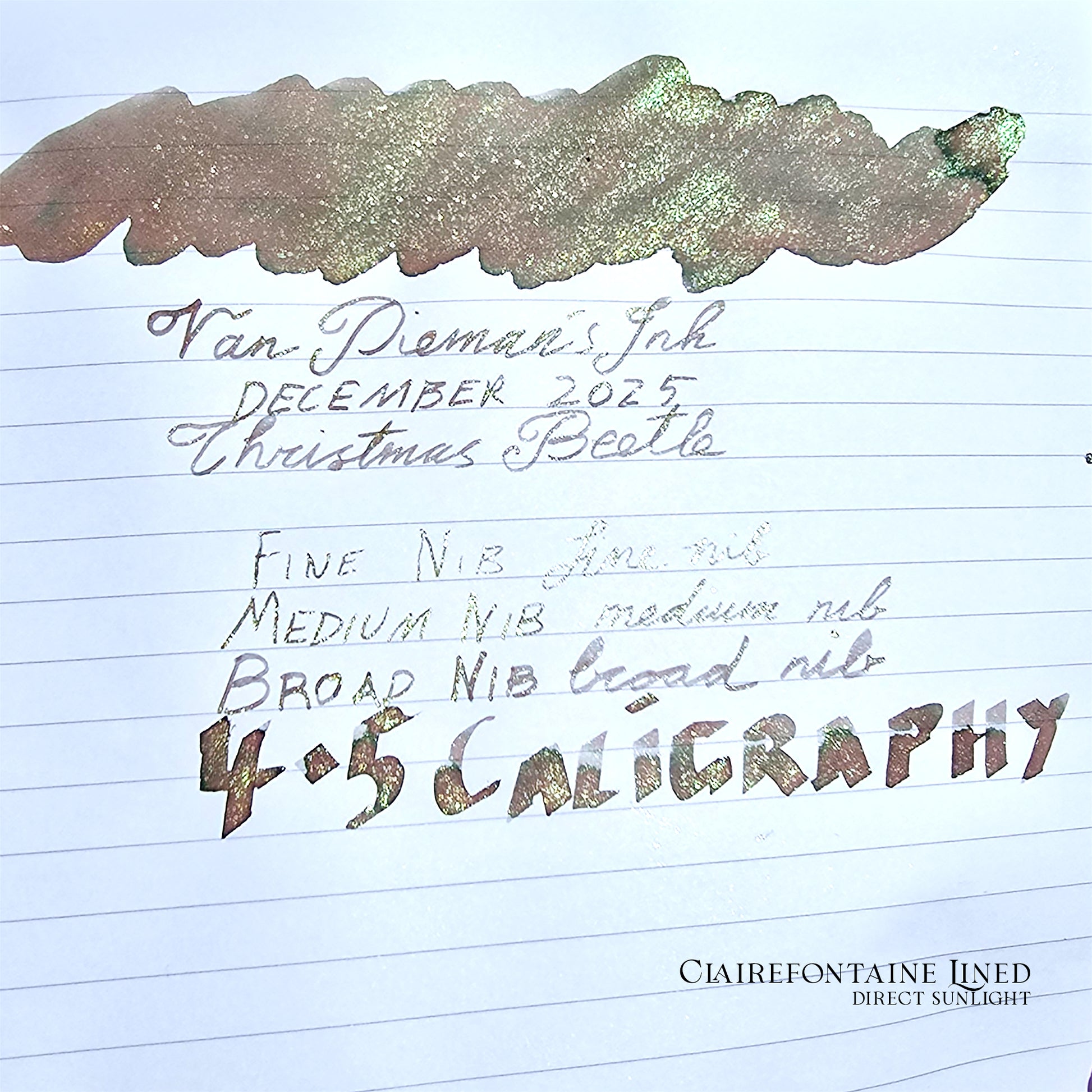 Inspired by this beloved seasonal icon, Christmas Beetle is a richly expressive multichromatic shading ink that shifts in remarkable ways depending on paper, lighting and nib choice. The base colour is a warm copper brown that sits between Riverbank from our Natura Dualis collection and Woollarawarre Bennelong. It is darker and earthier than the former, yet lighter and more radiant than the latter. When it pools it deepens into umber and mahogany. When it spreads it opens into tans, greys, greens, blues and gentle pinks. Every stroke reveals something different, making it one of the most dynamic inks we have ever created.