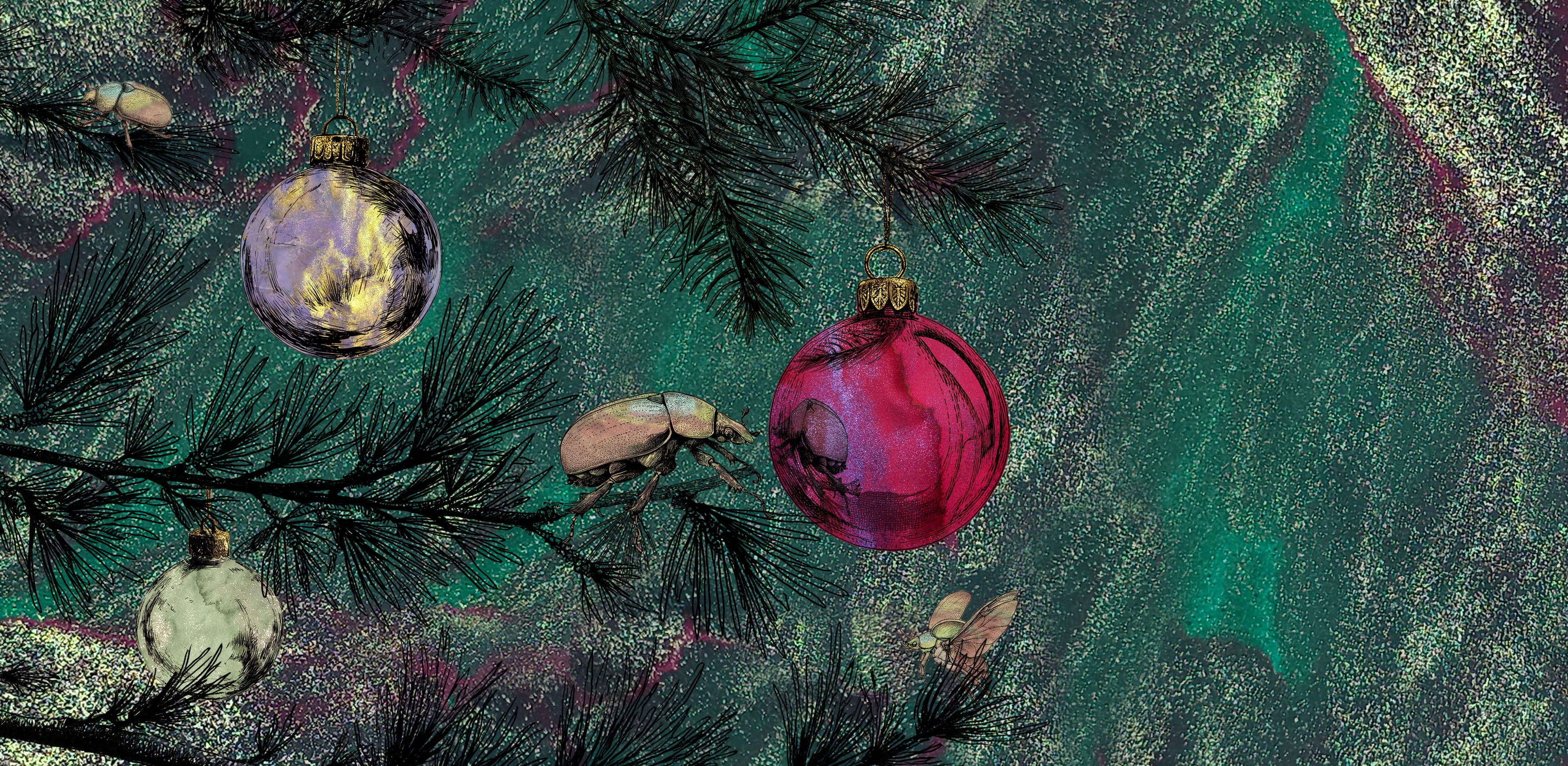 The artwork for this release was a combined effort from the Van Dieman’s team. It layers line art with swatches of 2025 inks. Rainbow Scarab forms the background, with Peacock Spider, Firefly and Luna Moth creating the baubles, Honey Bee forming the clasps and ties, and Christmas Beetle ink colouring the beetles themselves.