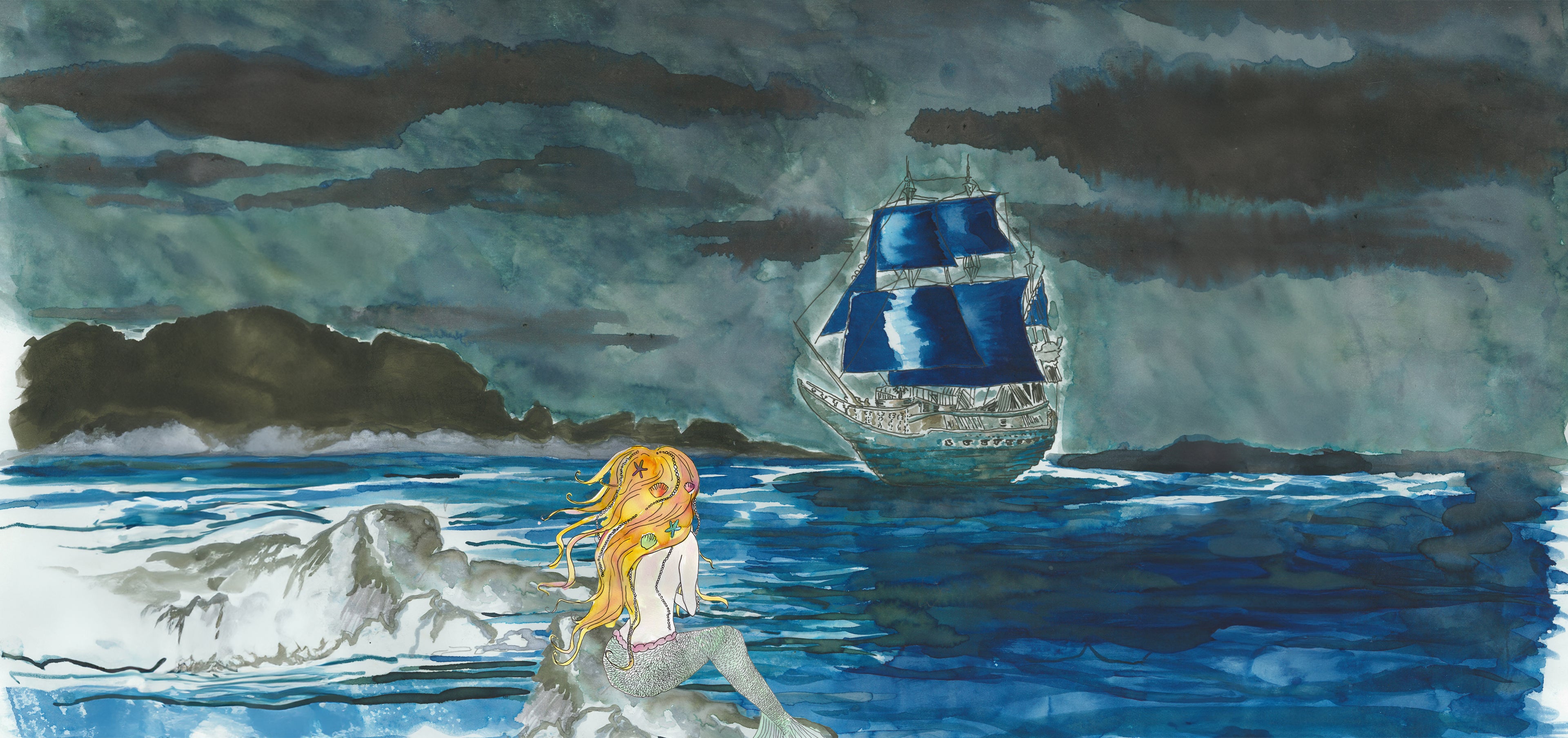 The artwork, painted by Belinda entirely with Van Dieman’s inks, brings the story full circle. Hanging Lake, a dark and moody blue from the Wilderness Collection shapes the sea and sails, Hailstorm, from Tassie Seasons, builds the brooding sky, and Federation Peak, also Wilderness, anchors the rocks. The mermaid herself is rendered solely from head to toe with Orchid Mantis from 2025 and European Honey Bee Chin, with a single drop of Bioluminescence woven into her tail. Her hair ornaments draw from the Underwater collection, including Royal Starfish, Parrot Fish, Sea Dragon, Sea Shell and Moon Jellyfish, echoing the treasures of the deep.