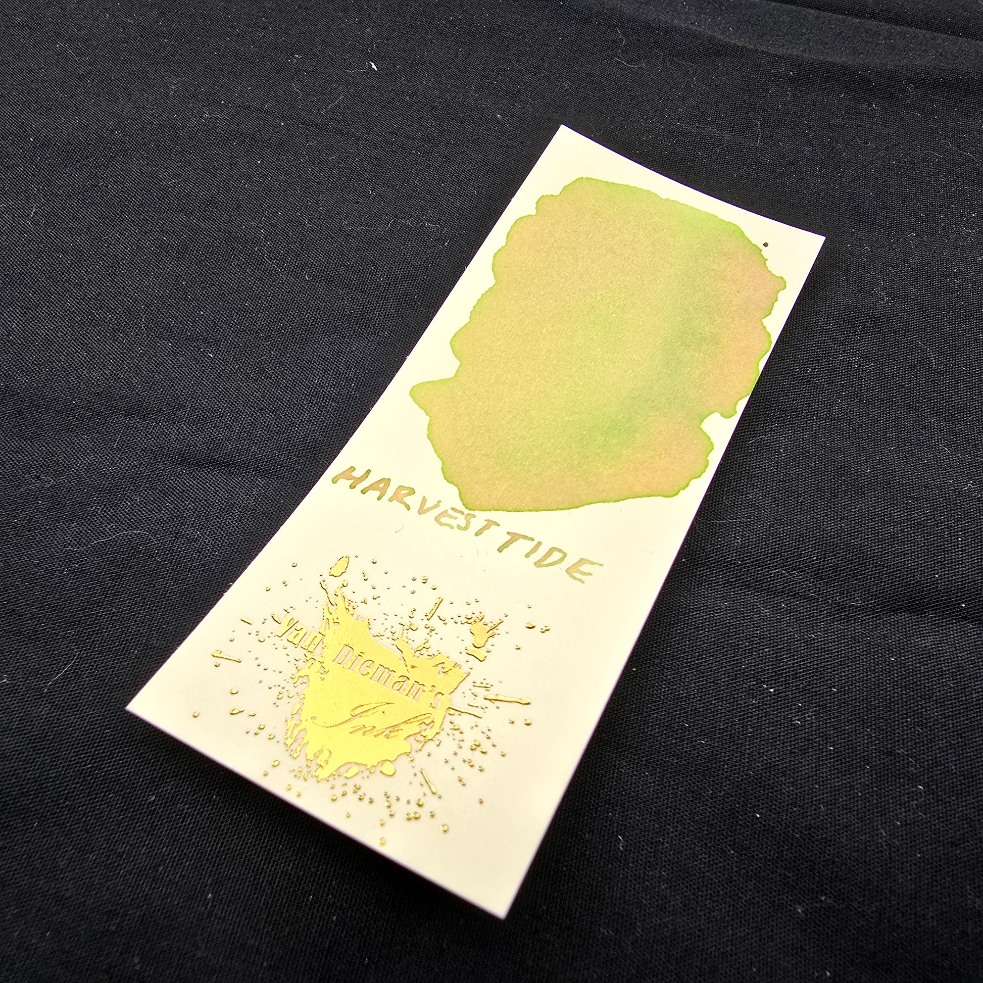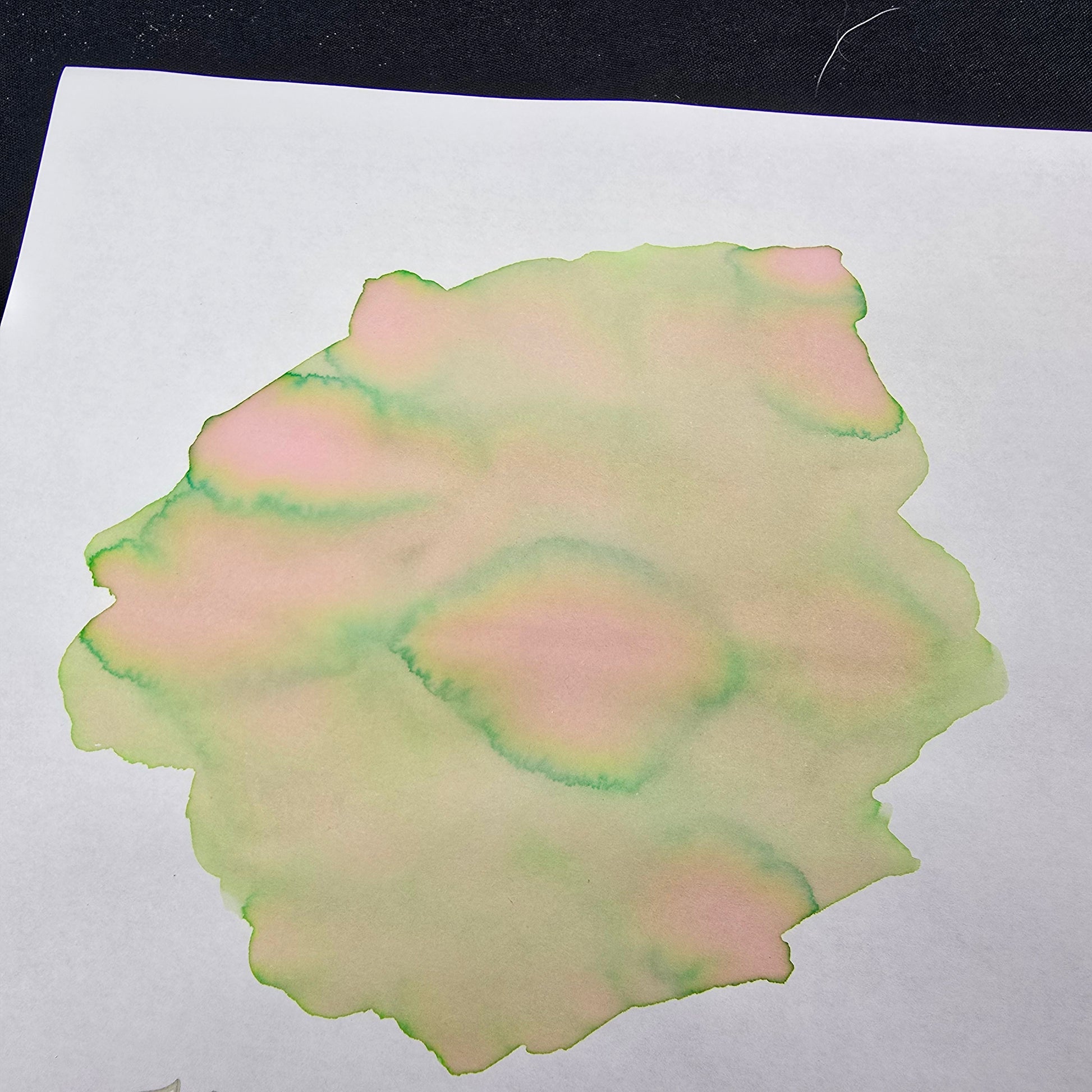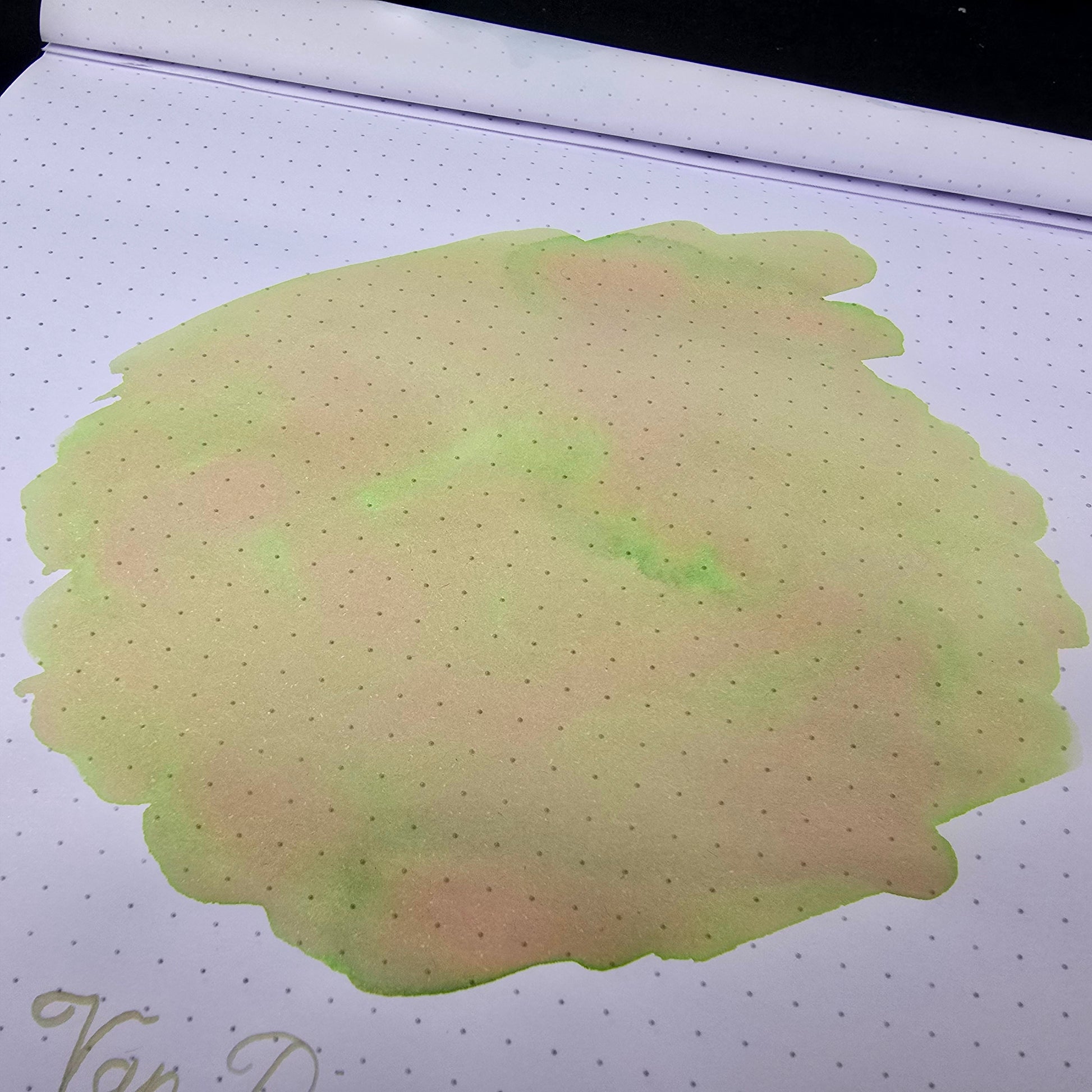 The colour is soft but richly complex. A mellow golden base gives way to cool green halos and hints of rosy warmth in areas of ink pooling. The shading is subtle but unmistakable — layers of warmth and coolness, ripeness and rest, all in one. On Tomoe River and other high-performing papers, expect dramatic multi-tonal flow; in regular writing, a warm, organic variation that settles into something timeless.